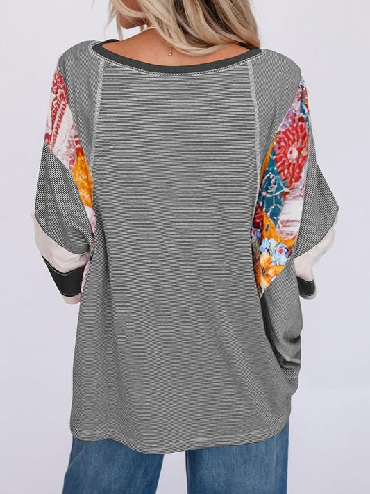 ✨Women's Casual Striped Floral Print Patchwork Oversized 3/4 Sleeve Top