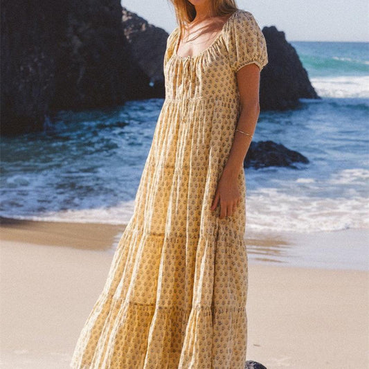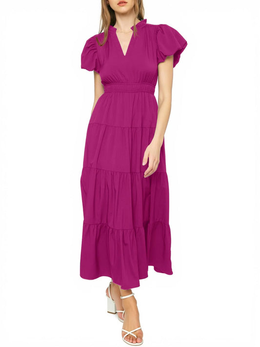 Puff Short Sleeve V Neck Flowy Tiered Beach A-Line Dresses