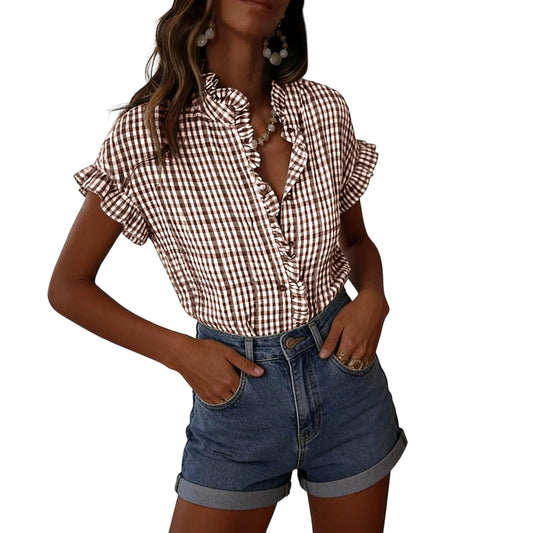 Women's Ruffled V Neck Gingham Short Sleeve Button Down Blouse