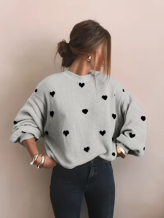 Women's heart-patterned crew neck knitted sweater