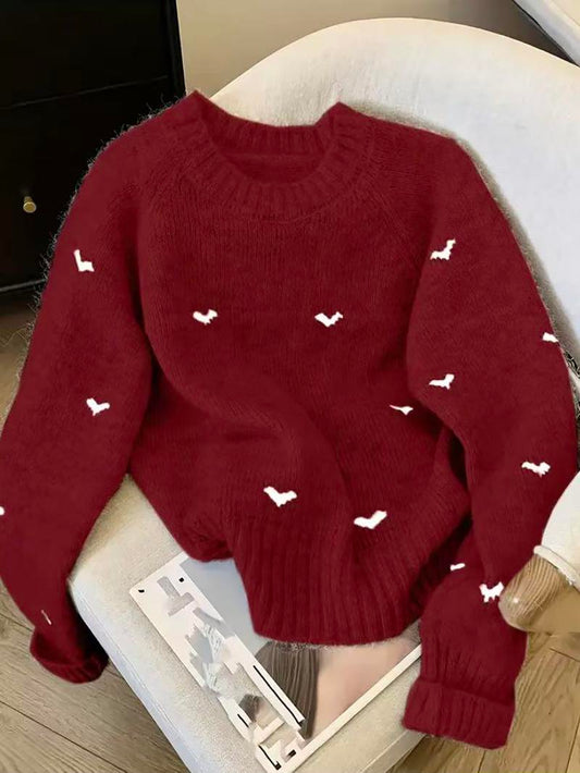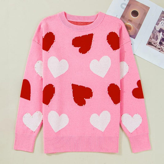 Pearl Embellished Heart Pattern Valentines Day Sweater