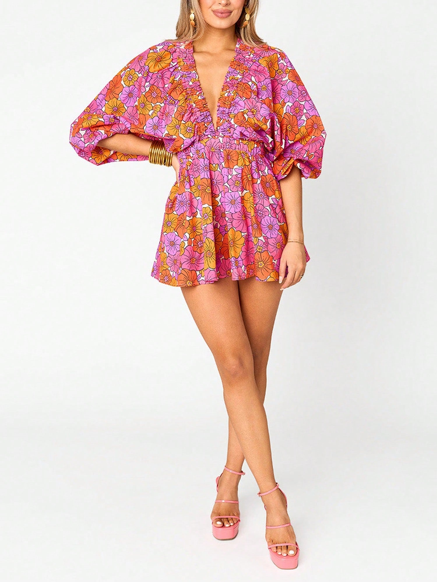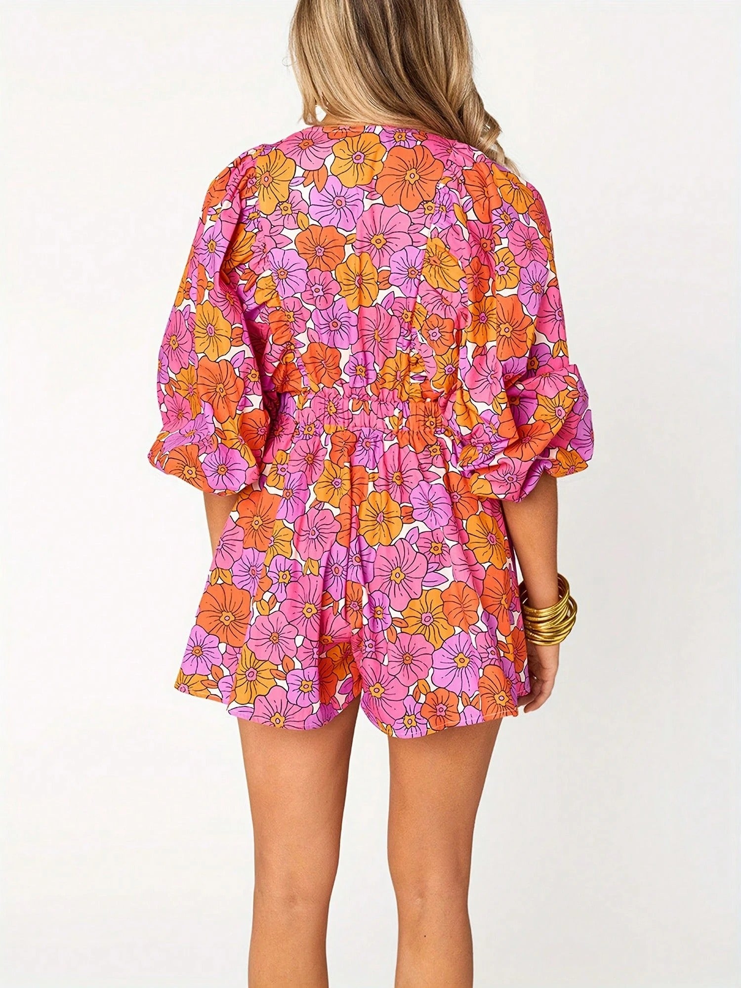Feel perfect in the Palm Beach Romper! Show off your girly side in our tangerine print, complete with a fabulously plunging V neck, balloon sleeves. No zippers or hooks needed - just slip it on and plunge into summer!