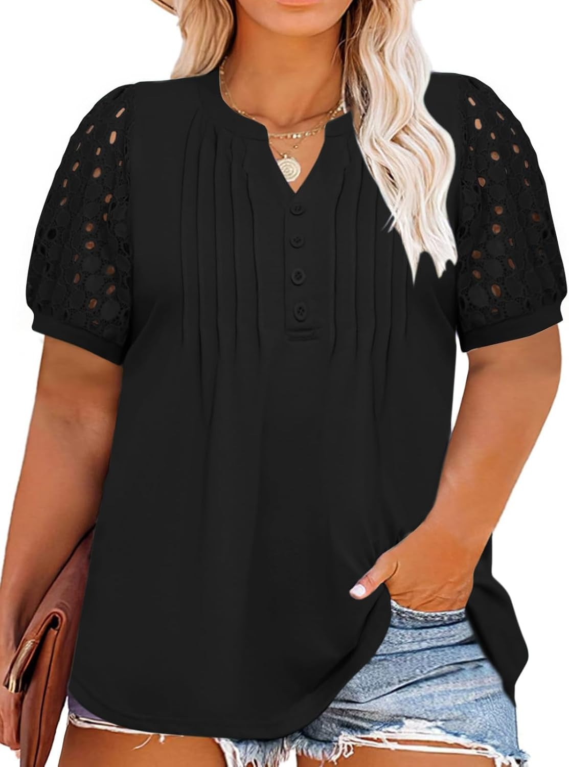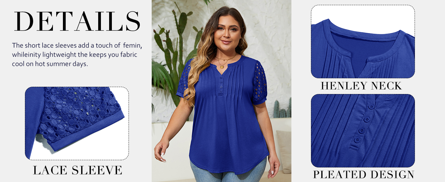 Our women's plus size henley combines comfort and style. Delicate lace sleeves add a touch of femininity to this casual top, and the henley neckline adds a modern twist to this classic shirt, giving it a modern and chic look.The relaxed fit and lightweight fabric make it ideal for all-day wear.