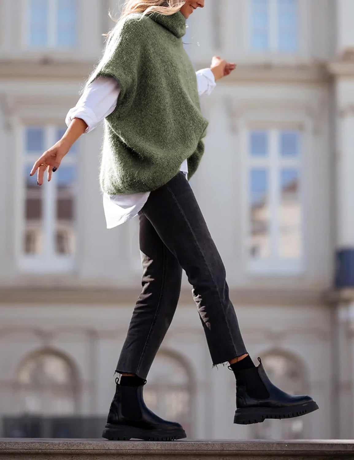 Style-out the cold with this soft-knit poncho, the perfect throw-on piece for casual winter days. Featuring a roll neck and sleeveless silhouette.