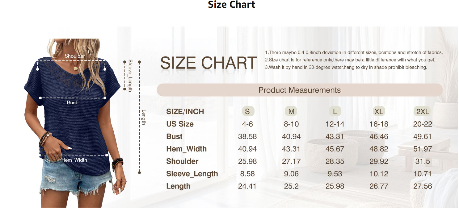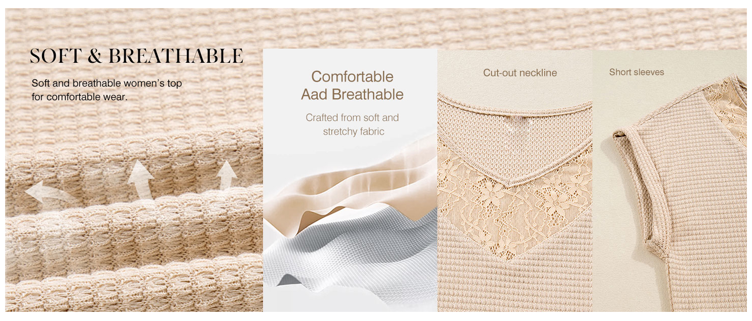 Women's trendy summer waffle knit top, V-neck with hollow-out lace detail, short sleeve and breathable, stylish and versatile for summer days!