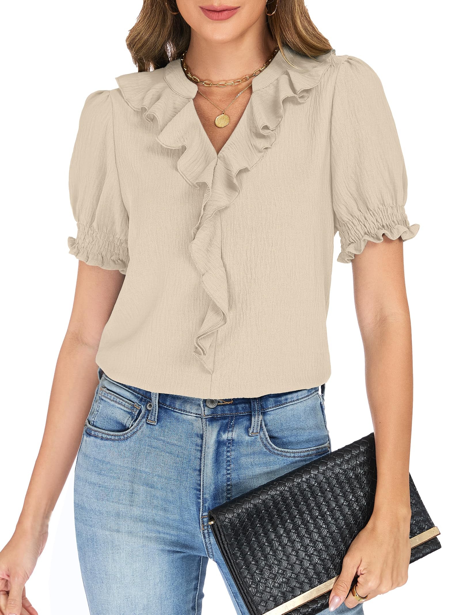 Elegant puff sleeve V-neck ruffle top with smocked cuffs, flattering and stylish, perfect for summer business work and casual dating.